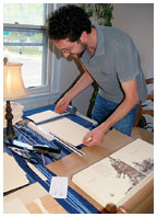 A publishing house that creates each book by hand With the growth of digitized information on the Internet, and companies like Google bringing stacks of books virtually into people's homes and offices at the click of a mouse, some pundits are prophesying the end of "real" books. But Alexander Bick, a graduate student in Princeton's history department, isn't convinced that we've seen the end of books that you can hold, mark up, and pass on to someone else. With two friends, Bick founded an independent publishing house, Crumpled Press, whose editors and volunteers, including Princeton graduate students, make each book and pamphlet by hand. In doing so, they are honoring the idea of books as aesthetic objects, not just transmitters of information. In May, Crumpled Press was in the middle of binding its latest book, Codex in Crisis, by Princeton history professor Anthony Grafton, about digitization of information and the future of bricks-and-mortar libraries. (For more on Grafton and his book, see the Q&A below.) On the living-room floor in Bick's Princeton apartment lay folded laser-printed copies of the pages of Grafton's book — flattened by gym weights. On a table was a box of book covers made from hand-molded French paper, alongside another box of prints — depicting the burning of the library in Alexandria — that would be taped carefully into the manuscripts. Each book would be folded, cut, and sewn by hand, using an awl to poke holes in the pages and needles and thread to bind the books. The editors seek to create a community of readers, writers, and bookmakers by hosting book-binding "parties": Ten to 15 people gather in Bick's apartment for stretches lasting eight to 10 hours, including wine and cheese breaks. All the editing and labor is done voluntarily. "It's a labor of love," Bick says. Founded in 2005, Crumpled Press aims to promote the "tactile" reading experience that can't be duplicated by reading information on a computer screen. "We are experimenting with how the reading experience can be transformed," Bick says. With eight pamphlets and books published to date, the press publishes first-time authors and writings that might have been tossed aside — hence the name Crumpled Press — because they were not commercially viable for a mass-market publisher. This month Crumpled Press hopes to finish 'Tis of Thee: Reflections on the Fourth of July by Christopher Moses, a Princeton graduate student in history, based on a lecture he delivered last year to public school students in New Hampshire. The press prints between 100 and 1,000 copies per book, charging from $5 for its first pamphlet of poetry to $30 for Grafton's book. Among those who helped produce Codex in Crisis were Laura Giles, curator