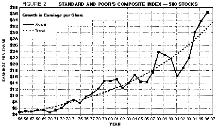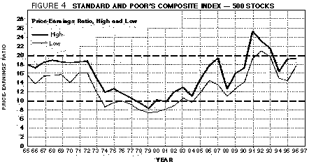 You can find actual PE-ratios for the major U.S. stock-market indexes tucked away somewhere in Barron's, a weekly publication by the Dow Jones Company. Currently (December, 1996), the PE-ratio for the S&P 500 is between 20 and 21. You will conclude from Table 1 that PE-ratios for the S&P 500 above 20 require truly optimistic assumptions about our economy. Indeed, as is shown in Figure 4, historically that ratio has rarely stayed above 20 for very long. Thus, it seems fair to say that we seem to be moving now into the more heroic corner of the defensible forecasts for the main factors that drive the intrinsic value of the S&P 500 (the area framed by the double line). By the way, as you can see in Figure 4, during the pessimistic 1970s, the PE ratio of the S&P 500 spent a good bit of time in the single digits.