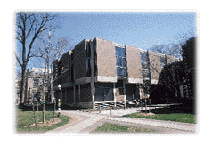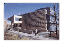 An altogether more enjoyable exercise in architectural deconstruction is Gwathmey and Siegel's McDonnell Hall (1997), which is attached to Stubbins' hopeless Jadwin Hall. McDonnell would be obnoxious elsewhere, but with neighbors like Fine and Jadwin, a building has the right to go bananas. McDonnell's Washington Road façade is particularly riotous. The architects have taken Jadwin's dull window bands and broken them up into disjointed segments recessed within irregular volumes resembling crazy rows of bureau drawers. These protruding "drawers" are clad in slanting metal panels with boldly articulated ridges. An irregular vaulted roof contributes to the antics by sloping over the façade in an irregular zig-zag. Because of these tricks, and because the building is situated on a grade tilted downward toward Lake Carnegie, the viewer is left wondering if the floors inside aren't tilted upward.