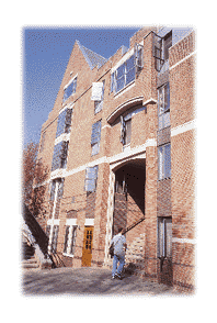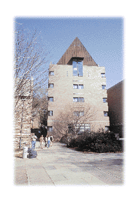 Venturi's theories are also evident in two buildings of a decidedly expressionistic stripe, Bowen Hall (1993), the home of the Princeton Materials Institute, and Feinberg Hall (1986), a Wilson College dormitory. Designed by Alan Chimacoff, Bowen is located across Prospect Avenue from Charter Club. Its design revolves around a bewildering, polychromatic array of rectilinear grids: a frame of vertical and horizontal granite members, a metallic network of fins and bullnoses, and yet another network of window frames. The building also boasts expanses of brick. Chimacoff's bricks, however, are not only square rather than oblong, but deliberately indeterminate in color -- depending on the light, as the architect has noted, they might appear maroon, purple, or metallic.