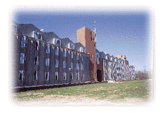 Rodolfo Machado's mainly red-brick Scully Hall takes the dismal proximity of New New Quad in stride, but is fairly expressionistic even so. Scully has three connected wings. The south wing is conceived as the centerpiece of an eventual triad of buildings arrayed in an arc at the south end of the campus, with a laboratory and another dormitory seen as possible future neighbors to the east and west. Machado has sought to enliven Scully's exterior with a random masonry pattern employing bricks in a wide variety of sizes. His stringcourse moldings, also of brick, are literally sharp-edged, and unappealing to the eye, especially compared to their molded limestone counterparts on the university's collegiate-gothic dormitories. The south wing's roof profile is a series of triangles, with square, grayish-green slates tilted at 45-degree angles. Skylight panels, more modestly scaled than those on the Woolworth addition, protrude above the roofline, as does a tower with the Princeton shield etched in metalwork. The curved façade facing Pardee Field is articulated with pre-cast panels of gray concrete whose rumpled configuration recalls the folds of an accordion. Machado's idiosyncratic brick masonry, abundance of oblique angles, and picturesque southern roofline notwithstanding, the Scully quad seems strangely lifeless.