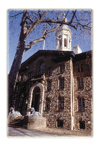 At Nassau Hall, a splendid classical example of a broad mass in repose, the interplay between lines and curves is more abstract, but beautiful even so. The dominant horizontal lines are counterbalanced by the boldly articulated masonry surrounds with which John Notman, who renovated the building after an 1856 fire, enriched the round-headed main entry and window above, by the curves of his exquisitely proportioned two-tiered cupola, and by the Palladian windows of the south wing. The pair of tigers reposing on the cheekblocks in front of the building is the naturalistic icing on the cake. The result is an architectural ensemble of great resonance. Alexander Hall, for its part, is not endowed with Nassau Hall's beautiful proportions. Yet the building's combination of abstract and naturalistic lines, however imperfect, appeals at an instinctive level.