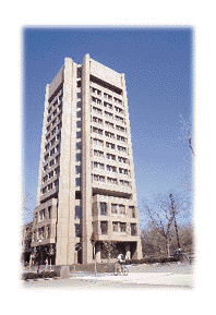Nor are there any architectural curves to speak of in Edward Larrabee Barnes's New South (the administrative building near the PJ&B station, completed in 1965), or in the original buildings of Wilson College or the Engineering Quadrangle. Perhaps that's one reason for the presence, near E-Quad's entrance, of Upstart 2, Clement Meadmore's huge stylized metal phallus, which rises off a curvaceous base. No architectural curves are found, either, in the math-physics complex of Fine and Jadwin Halls (1968), or in Stubbins's New New Quad (built in 1964 and now part of Butler College), with the exception of the latter's bizarre curly-cued metal parapets, derided by two generations of students as "bicycle racks." The architects of Fine Tower did attempt to make this forbidding brown behemoth more interesting through the complex articulation of its chamfered corners. The result, observes Ben Kessler, an authority on Princeton's architecture, is an abstract rendition of Cram's Cleveland Tower.