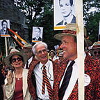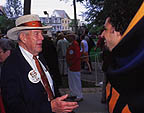 Left: J. B. Smith '45 *47 greets a banner bearer. Right: Jack Geisel