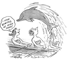two of the rowers in the stern spotted a group of dolphins frolicking,