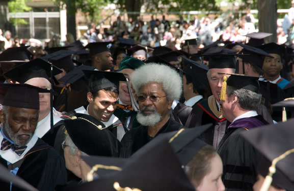 At the center of a sea of caps and gowns is Nigerian playwright, poet, novelist and political rights activist Wole Soyinka, one of six people presented with honorary degrees during Commencement.
