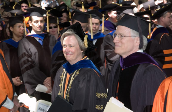 Proceeding toward the stage in front of Nassau Hall are President Tilghman and Robert Rawson '66, outgoing chairman of the executive committee of the Board of Trustees.