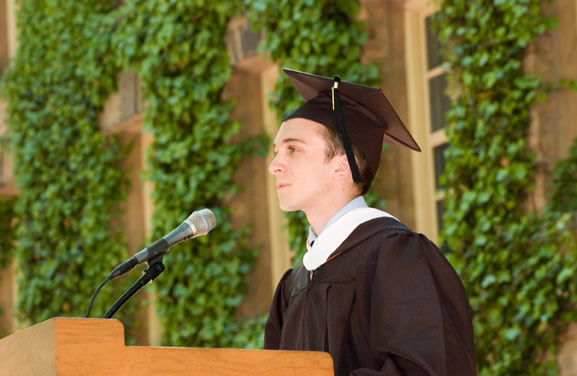 Graham Phillips '05, a history major, delivers the salutatory address in Latin, dating back to the time when the entire ceremony was conducted in Latin. ÒDo not forget Princeton , our alma mater,Ó he urged his classmates. ÒDo not forget your real mother, either, unless you like nagging phone calls.Ó |