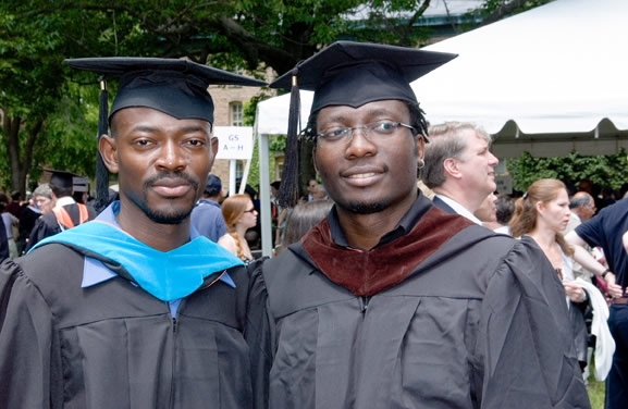 Preparing to pick up their diplomas are Nii Addy, who received a master's in public affairs, and Adekunle Adeyemi, who received a master's in architecture.