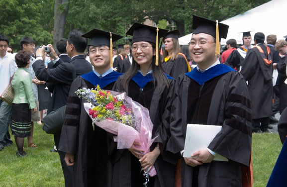 Celebrating their Ph.D. degrees in mechanical and aerospace engineering are, from left, Zhenwei Zhao, Juan Li, and Tianfeng Lu.