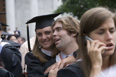 Andrew Ianuzzi receives a celebratory hug from Molly Jones, left, after Commencement.
