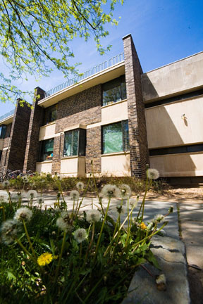 | Architect Hugh Stubbins, who also designed Jadwin Hall and Mudd Library, wrote that his Butler dorms were meant "to capture the traditional scale [of collegiate gothic architecture] in a modern idiom." For example, he used decorative metal parapets, like the ones lining the roof of Lourie-Love Hall, to evoke Gothic crenellations. Students dubbed them "bicycle racks."