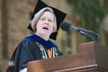 | President Tilghman delivers her Commencement address. Tilghman spoke out against federal standardized testing for colleges and universities. “The homogeneity bred by standardization would almost certainly drain color and vitality from this rich national tapestry,” she said. “Where we see our students as prime numbers, standardization sees them as elements of the least common denominator.” |