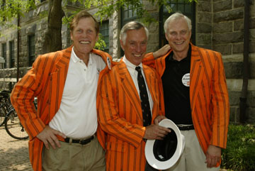 | With Reunions weekend temperatures reaching the high 80s, classmates Pepper Pettit '67, Searle Field '67, and John Alexander '67 find a hospitable spot in the shade. |