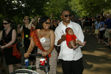 Marc Washington '97, right, and wife Anakela introduce daughter Nyla to the Reunions crowd.