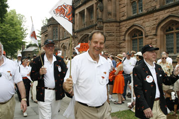 | Former New Jersey Gov. Tom Kean '57, center, and Randy Motland '57, left, and Bud Canaday '57, right, carry flags for the 50th reunion class. |