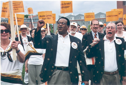 Steve Dawson, center, and Marc Weisburd, right, pump up the Class of 1970's ÒbuggyÓ procession.