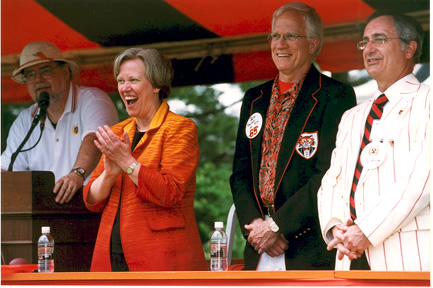 President Shirley Tilghman reacts with delight to a passing class from the reviewing stand. At left is P-rade narrator Gregg Lange '70. Looking on are Skip Rankin '72, outgoing Alumni Association president, right; and University trustee Robert Rawson '66, outgoing chair of the executive committee. |