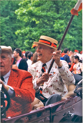 Hugh Wynne '39 enjoys the view from an antique car in the P-rade.