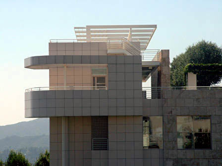 Freeway and UCLA's leafy Westwood campus in the distance. The Getty