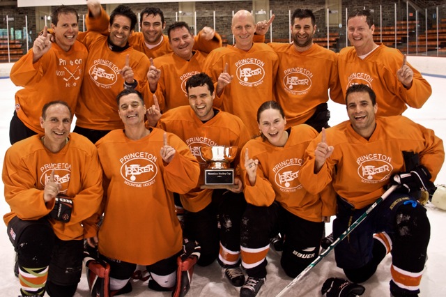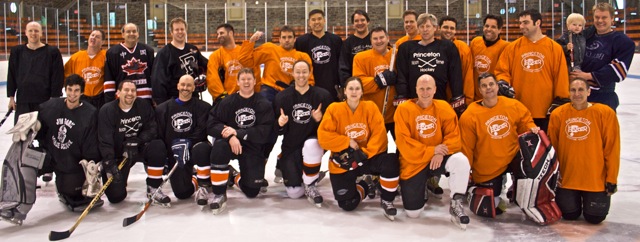 At high noon on Saturday, April 17, 2010, we gathered at Baker Rink for the game. Black started the scoring early with a goal just 12 seconds into regulation off of a laserbeam shot by Lars Hedin from the top of the circles. Shortly thereafter, Mayle missed a golden opportunity from point blank range sending the puck high and wide through the crease. Orange responded quickly with a goal by Masson to knot the score at 1-1. Play continued until Abel Kahn scored his first goal of the game for Orange. The first period ended with a 2-1 Orange lead.