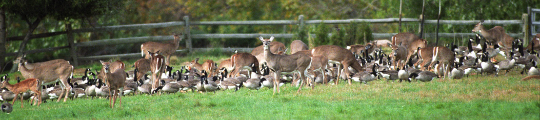 Deer, of course, are Princeton Vermin Number One. Disease-carrying pests that devour every kind of garden plant, they are aptly described as "rats with hooves". Worse yet, they are too stupid to get out of the way of cars, and indeed I have been in a car when it was struck on the SIDE by a leaping buck. There is a little compensation in the form of natural beauty. One may occasionally see (if one looks hard) a solitary doe in a pretty setting (rather than the hordes in the photo at the top of this page), a cowering fawn, a young buck with velvet, or even a mediocre trophy buck in the Princeton area. The problem is that, without any significant hunting pressure, the deer are still too numerous for their own good, and tend to be skinny and weak. (Princeton does not allow hunting with firearms, except by their dear-culling contractors; it would be far more sensible to encourage firearm ownership and deer hunting among the general populace; in that way the goose population might be reduced as well.)