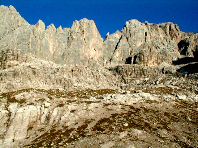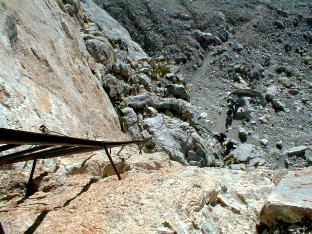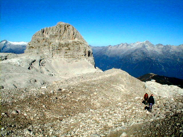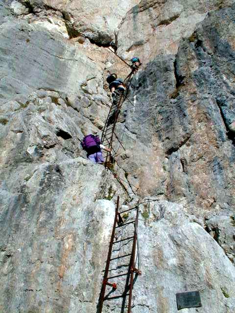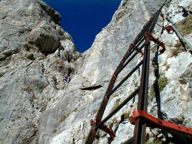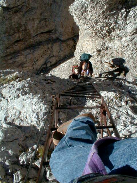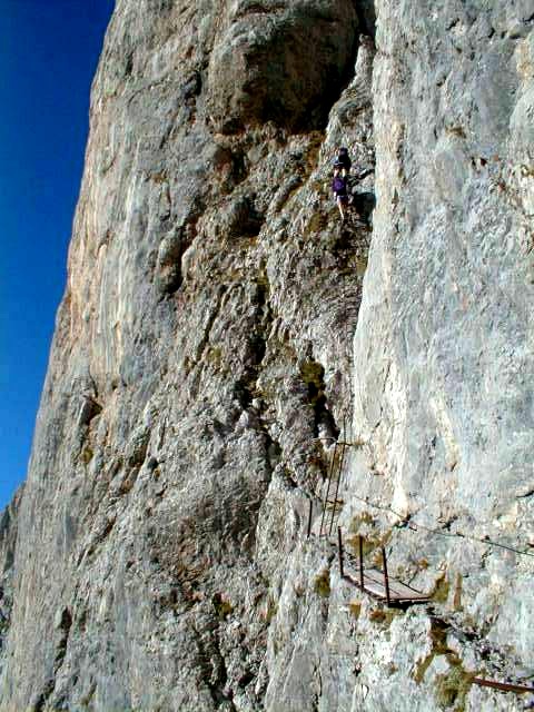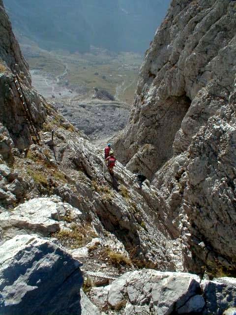 The long and rugged Catena d'Ambiez, which stretches South from the Cima Tosa forming the western flank of the Valle d'Ampbiez, seems to preclude any possibility of a direct link between the Agostini and XII Apostoli Mountain-Hut, situated on the opposite side. But the specially equipped "Sentiero E. Castiglioni", traversing the Boccetta dei Due Denti, satisfies this need and enables mountaineers therefore to avoid the traverse by way of the Bocca d'Ambiez. The path, however, is a very hazardous route requiring strong nerves, involving the ascent of smooth and very exposed rock-faces by means of long metal ladders (at least 10). ladder-lovers will certainly love this path!