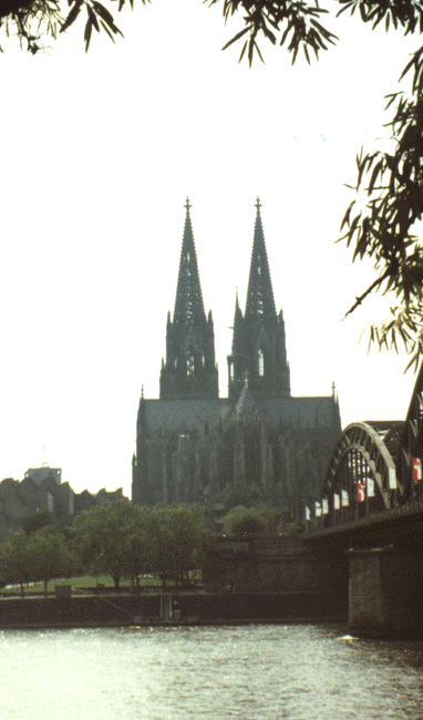 This totally changed my plan, as I had planned to have a short visit to Frankfurt in my first day in Europe (mainly for getting a visa) and take a trip through Paris, Brugges, Amsterdam, Cologne, Berlin, then go to the meeting in Friburg via Heidelberg. But now I need to returned to Frankfurt few days later. To make it worse I don't know exactly when my appointment will be until Jochen receive the letter from the Consulate. I could not afford not getting a US visa well before my flight back to the US, otherwise I was in danger of ending up being sent back to China (which is good though if the transportation is free). This upset, as well as the jet lag (6 hours) make the city Frankfurt even less attractive to me. I was desperately in need of sleep and food when I left the consulate, dejected. I managed to pull back to the main station by U-Bahn and have a MacDonald there, sent some postcards, and tried to figure out what to do. I decided to go to the nearby city of Cologne, which was two hours away by train and was more appealing to me with it's famous twin towers. The Train ran quietly along the picturesque Rhine Valley. Numerous ancient castles standed at both side of the Rhine river. The scenerary outside the window is so beautiful that the two hour trip felt like minutes. It's noon when I arrived at Cologne. The huge Gothic cathedral was right outside the Cologne train station. There was a large group of German punks out there. I took a picture of the them from far away using the powerful zoom of the new camera I just bought for the trip. Climbing to the top of the cathedral along the narraw stairway almost a thousand years old was not a trivial effort. I used the last ounce of energy I had to walked across the steel bridge to take a few pictures of the cathedral across Rhine. After that I took a little break and had some food in the old town, sent a few more postcards. Then I was on my way back to Frankfurt. I lingered around the train station, made a call to Jochen, and boarded the overnight train to Paris at midnight. Exhausted, I felt asleep immediately.