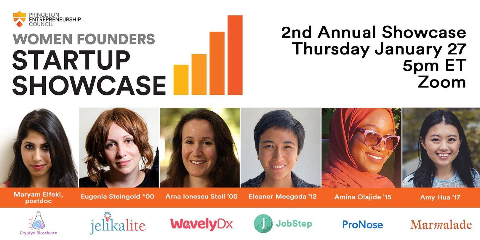 Princeton Entrepreneurship Council is pleased to present the 2nd annual Women Founders Startup Showcase. This year’s event will feature six outstanding Princeton founders who represent faculty/postdoc, graduate alumna, and undergraduate alumnae across the Princeton entrepreneurial community.
