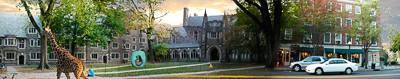 The rest of the work was as widely varied in subject and technique. Camila Chateau featured Nassau Street merging into Holder Courtyard, a giant giraffe wandering through the scene (shown below). In a sort of De Chirico meets Dali, Zach Ruchman merged skewed perspectives of Clio Hall, his friend Dora perching simultaneously in improbable places. Jacob Denz manufactured a Picasso-esque vision of his cello (“This image represents how I feel during orchestra rehearsals,” Denz quipped.) Jing Lin’s subject was a long corridor in Frist made to feel even longer through expert warping, merging and subtle color shifts.