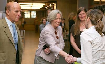From left, University Trustee and High Meadows Foundation Co-Founder Carl Ferenbach and President Shirley M. Tilghman went on a tour of the open house with Shana Weber, manager of the Office of Sustainability. Tilghman greeted Andrea DeRose, who recently joined the staff as transportation demand management (TDM) manager in Transportation and Parking Services.
