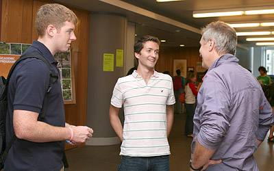 From left, junior Carter Simpson and senior Mark Smith talked with Professor Stephen Pacala about the future of the oil supply.
