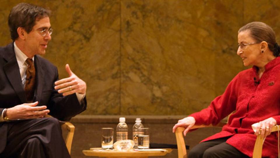 Princeton professor and director of the James Madison Program in American Ideals and Institutions, Robert George, right, moderates the question-and-answer session between students and Scalia, left.