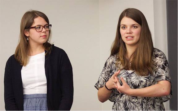 Juniors Katie Perez, left, and Helena Hengelbrok (along with Katie Breen, not pictured) explain how tuberculosis has affected Peru. (Photo credit: B. Rose Huber/Woodrow Wilson School)
