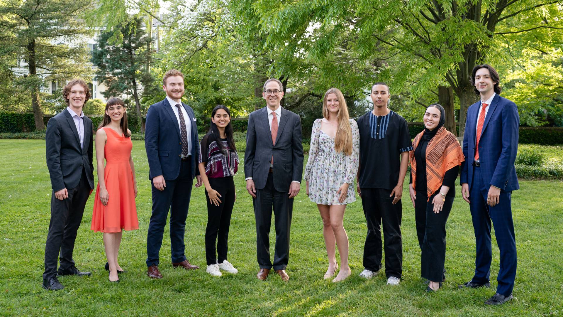 The 2024 Spirit of Princeton winners stand with President Christopher L. Eisgruber (center). The seniors are from left to right: Austen Mazenko, Madeleine LeBeau, Stephen Daniels, Archika Dogra, Hailey Mead, Max Diallo Jakobsen, Aisha Chebbi and Joshua Coan.