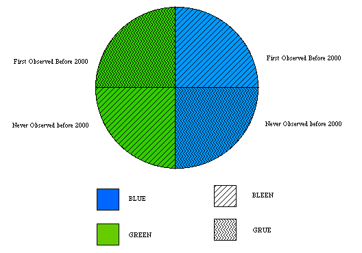 An object X isgrue iff X is green and first observed before the year 2000, or x is blue and never observed before 2000.