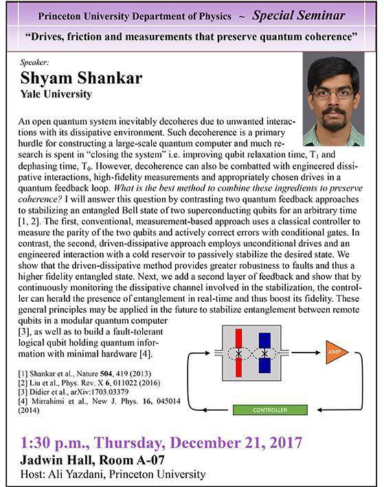 Shyam Shankar, postdoctoral research associate in physics at Yale, will present "Drives, friction and measurements that preserve quantum coherence" at 1:30 p.m. Thursday, December 21, in Jadwin Hall, Room A-07.