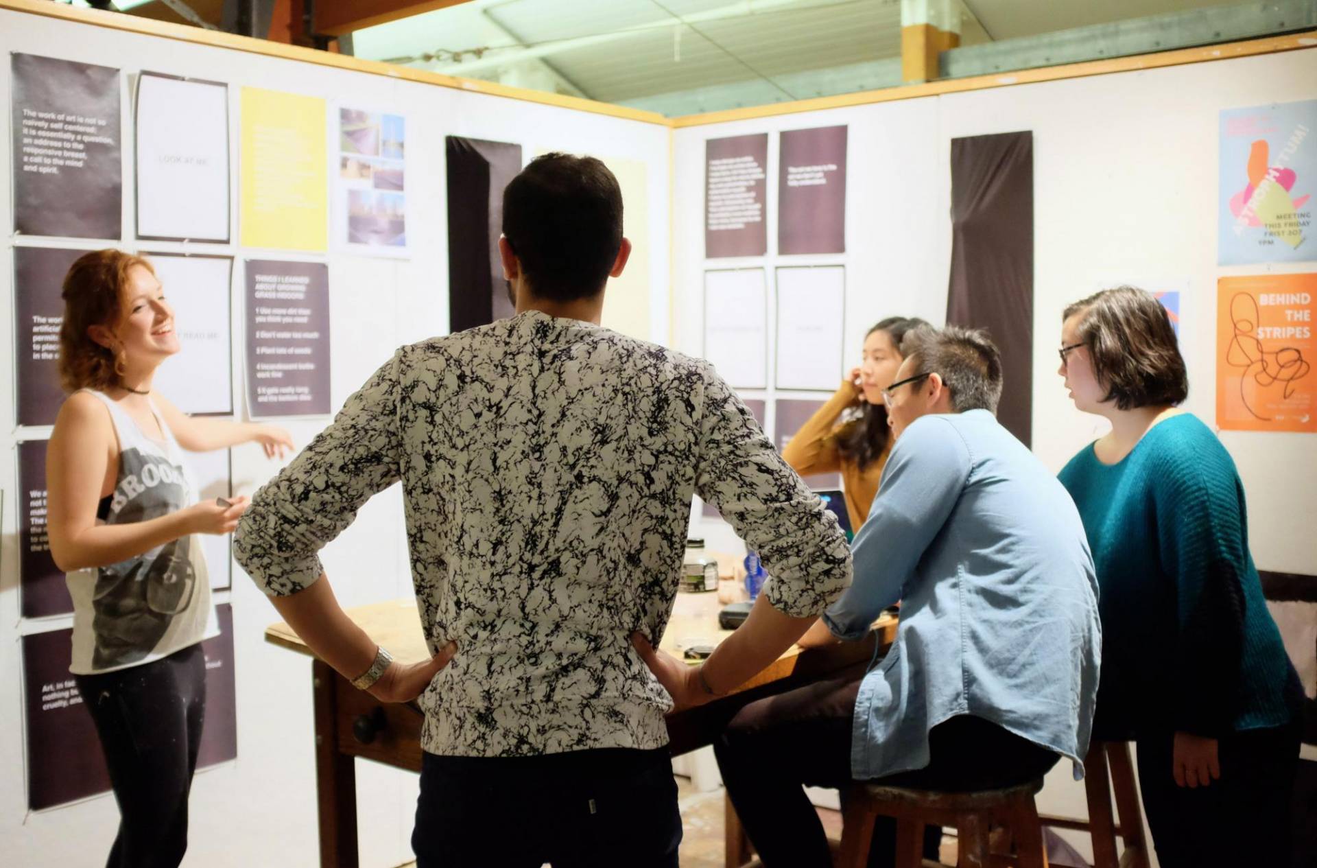 Visitors to a Lewis Center for the Arts Open Studios event learn about the work of one of the students in the Program in Visual Arts. Photo by Justin Goldberg