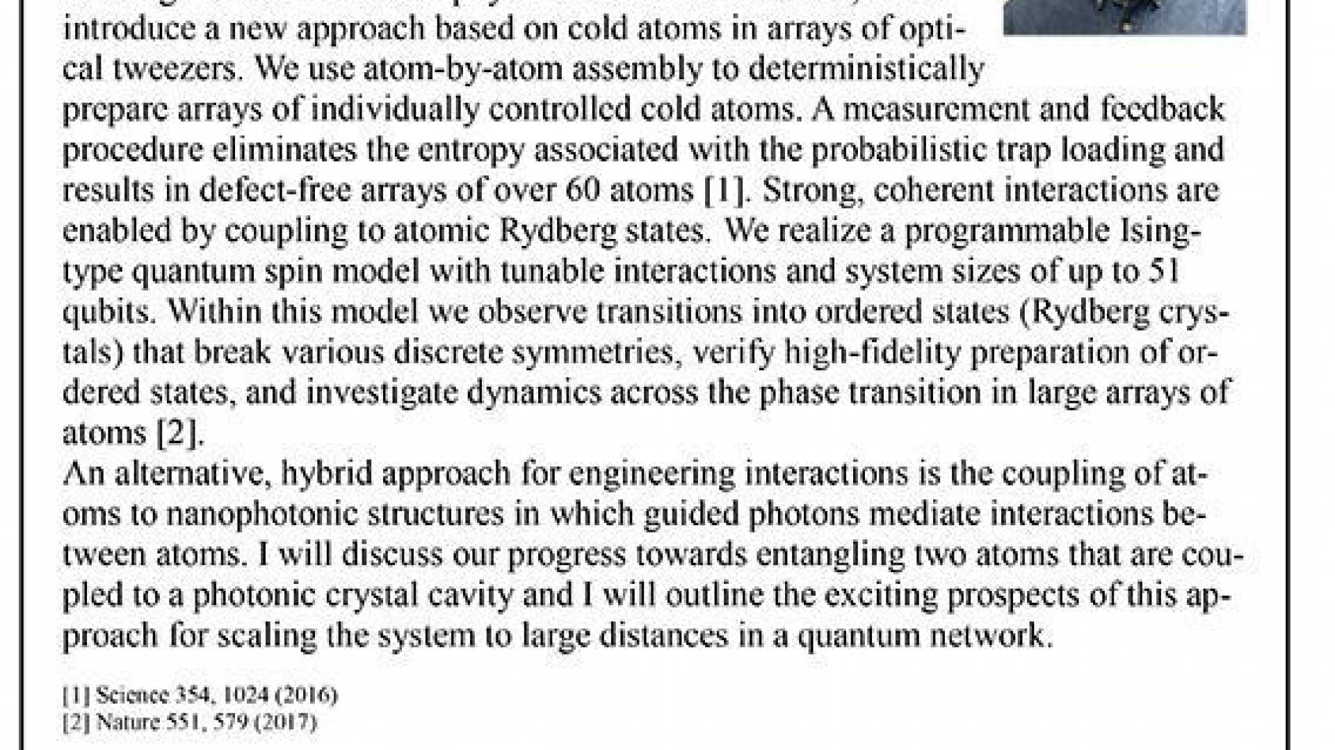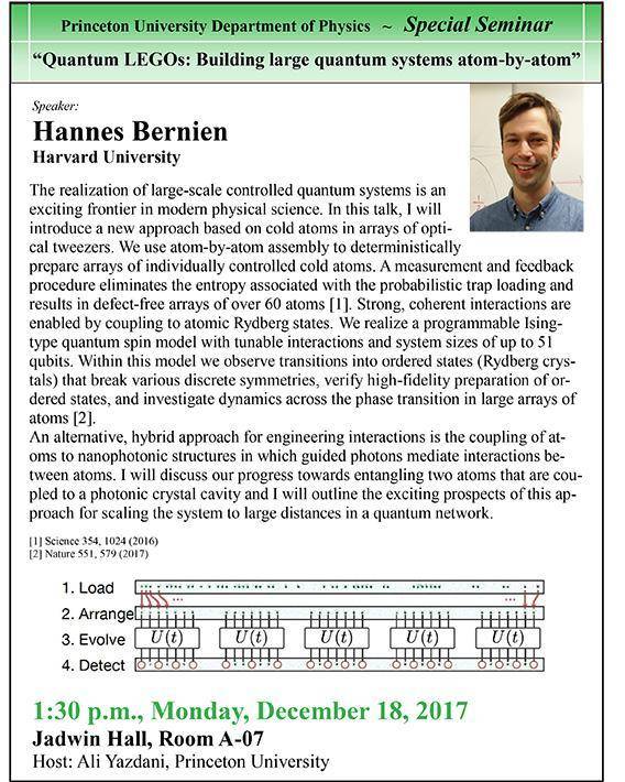 Hannes Bernien, post-doctoral fellow in physics at Harvard University, will present "Quantum LEGOs: Building large quantum systems atom-by-atom" at 1:30 p.m. Monday, December 18, in Jadwin Hall, Room A-07.