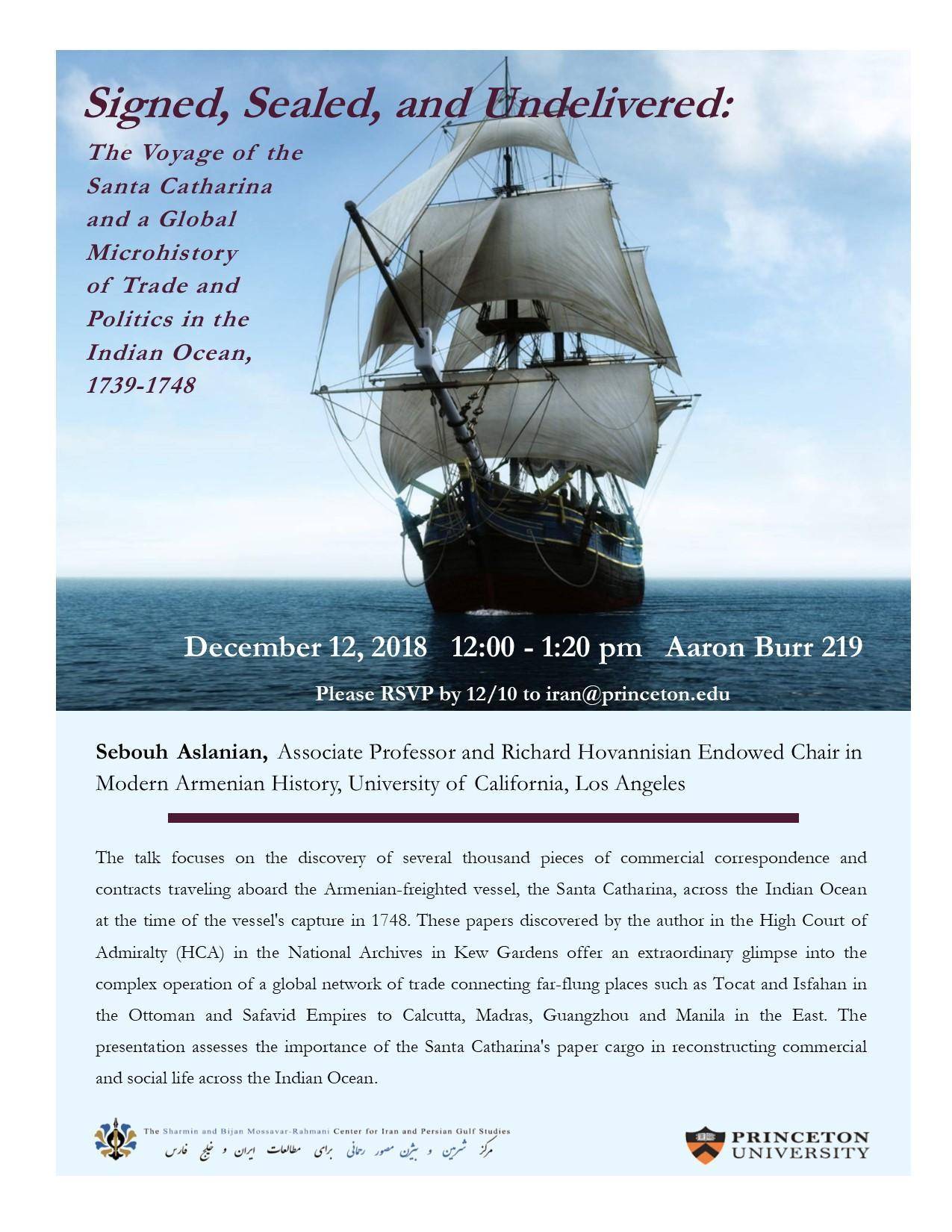 The talk focuses on the discovery of several thousand pieces of commercial correspondence and contracts traveling aboard the Armenian-freighted vessel, the Santa Catharina, across the Indian Ocean at the time of the vessel's capture in 1748. These papers discovered by the author in the High Court of Admiralty (HCA) in the National Archives in Kew offer an extraordinary glimpse into the complex operation of a global network of trade connecting far-flung places such as Tocat and Isfahan in the Ottoman and Safavid Empires to Calcutta, Madras, Guangzhou and Manila in the East. The presentation assesses the importance of the Santa Catharina's paper cargo in reconstructing commercial and social life across the Indian Ocean.