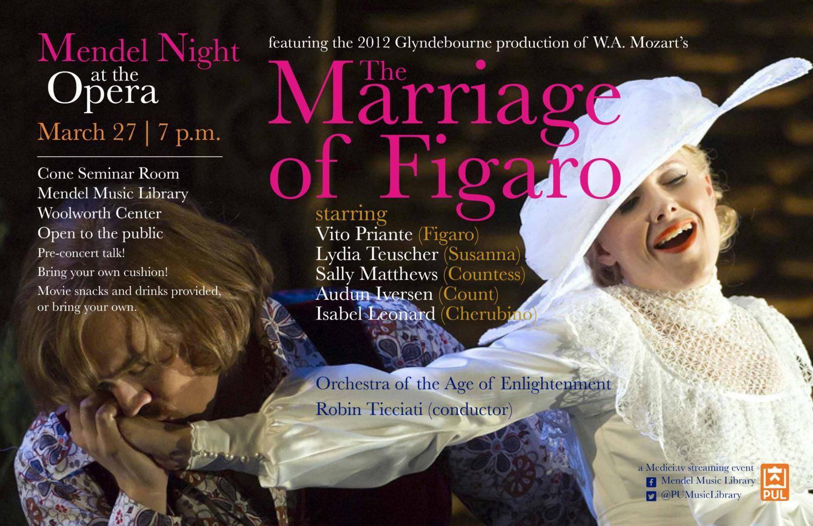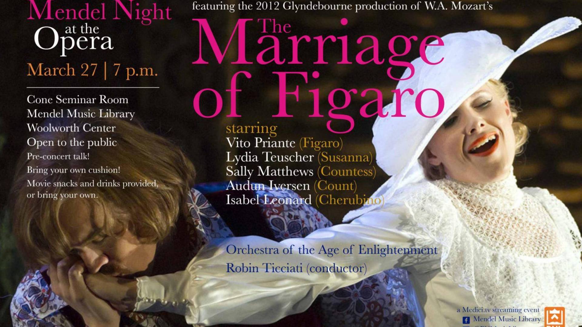 Mendel Music Library will stream the 2012 Glyndebourne production of W.A. Mozart's "The Marriage of Figaro," starring Vito Priante as Figaro, Lydia Teuscher as Susanna, Sally Matthews as Countess, Audun Iversen as Count, and Isabel Leonard as Cherubino, with the Orchestra of the Age of Enlightenment. Movie snacks and drinks provided, or bring your own!