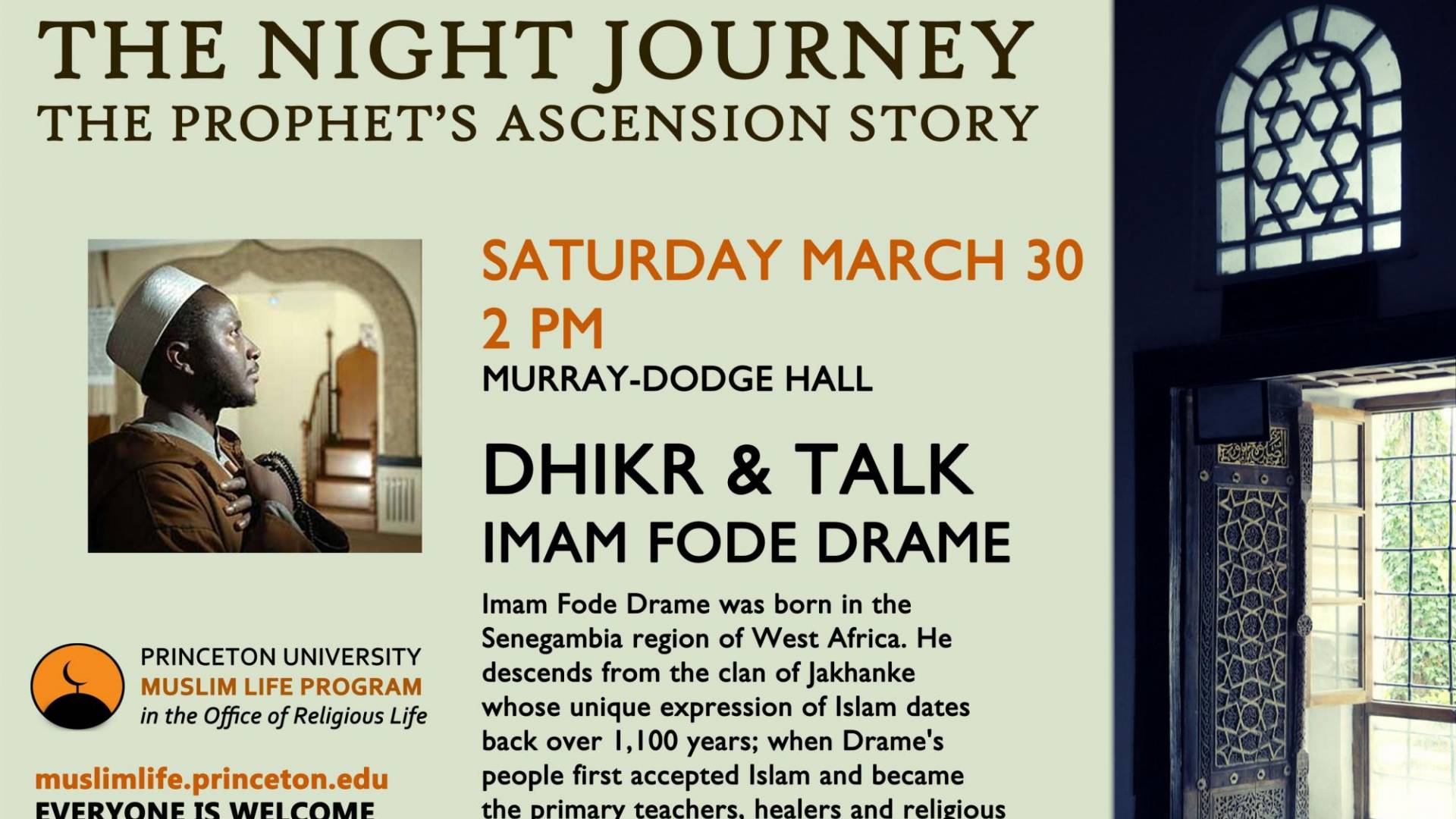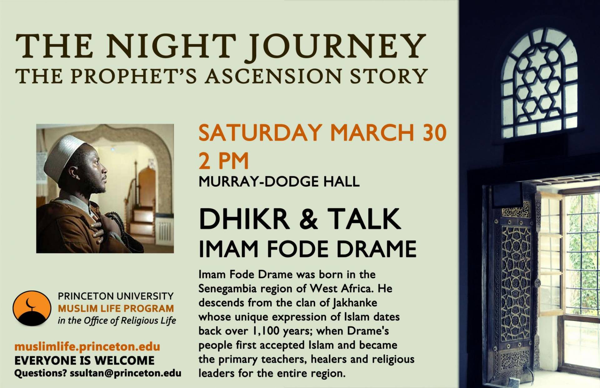 Dhikr & Talk with Imam Fode Drame. Imam Fode Drame was born in the Senegambia region of West Africa. He descends from the clan of Jakhanke whose unique expression of Islam dates back over 1,100 years; when Drame's people first accepted Islam and became the primary teachers, healers and religious leaders for the entire region. Hosted by the Princeton Muslim Life Program