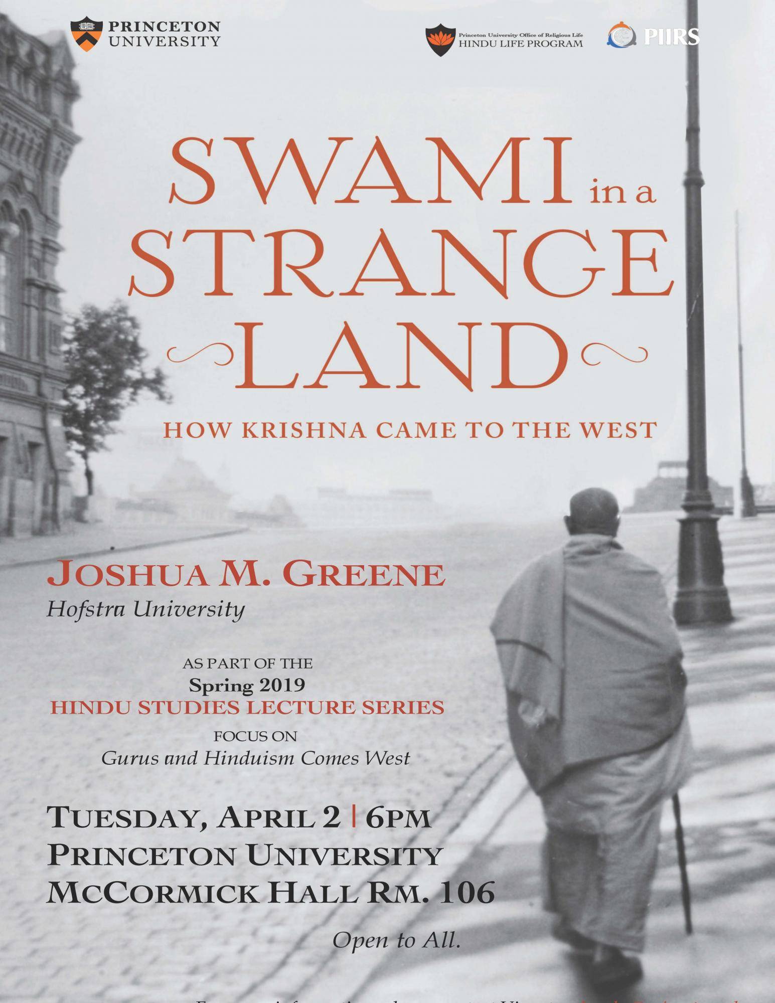 Please join us for "Swami in a Strange Land - How Krisnna Came to the West" with Joshua M. Greene of Hofstra University. This is part of the Spring 2019 Hindu Studies Lecture Series focusing on Gurus and Hinduism Comes West. Open to all. Please contact Vineet Chander with questions at vchander@princeton.edu