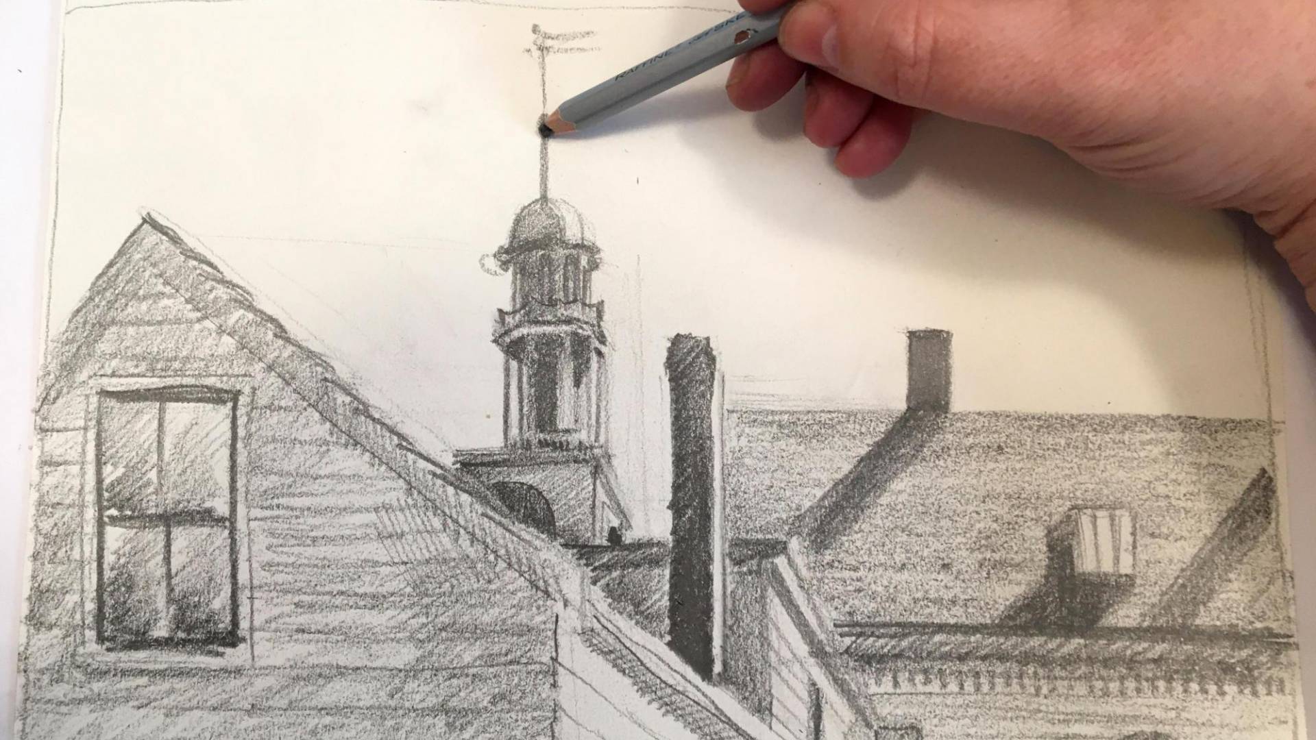 This live art-making class is inspired by Edward Hopper’s Universalist Church. In this partial view of an eighteenth-century Universalist church in Gloucester, Massachusetts, Hopper shows only the elegant white spire, obscuring the rest of the building with intervening houses. The lines of the roofs adjacent to the church lead the eye across both axes of the image to the steeple. In this class we will focus on creating a unique architectural composition by cropping the image and closely focusing on one aspect of a scene.