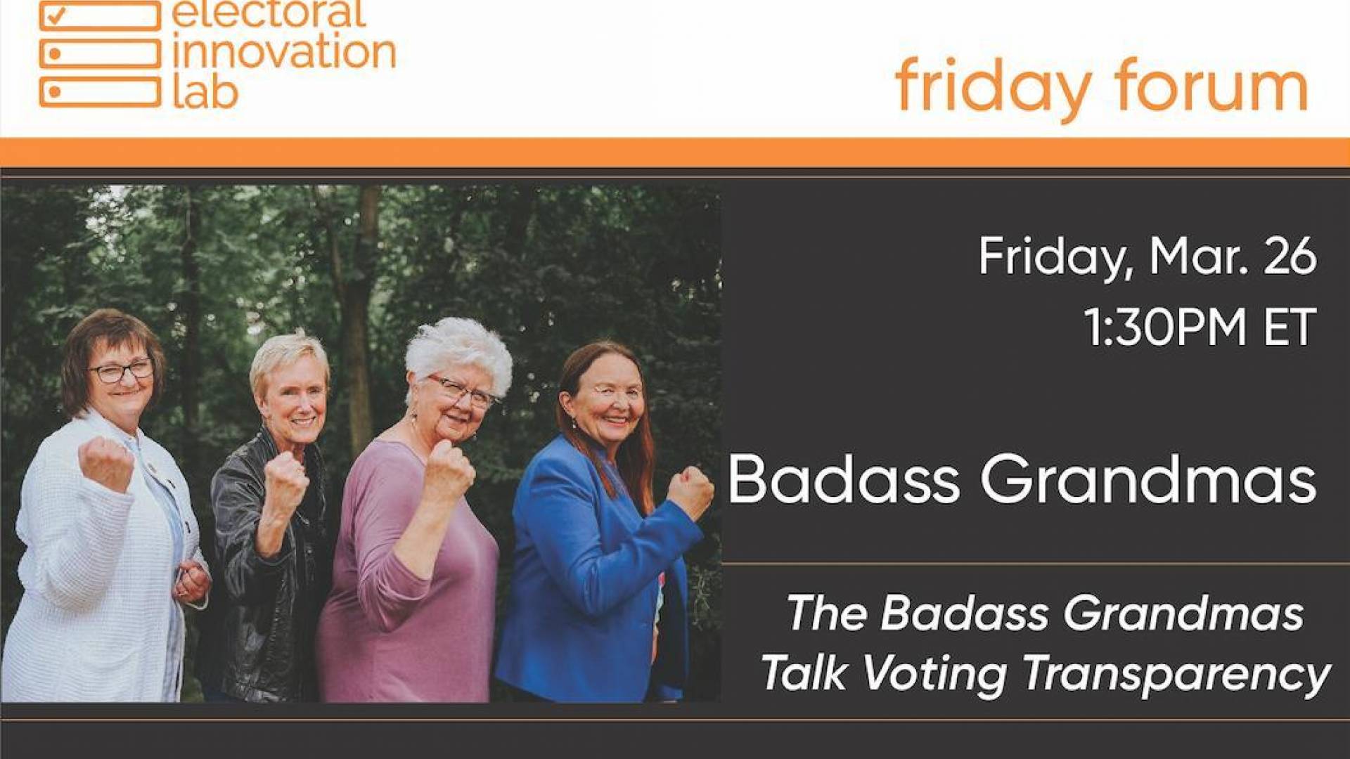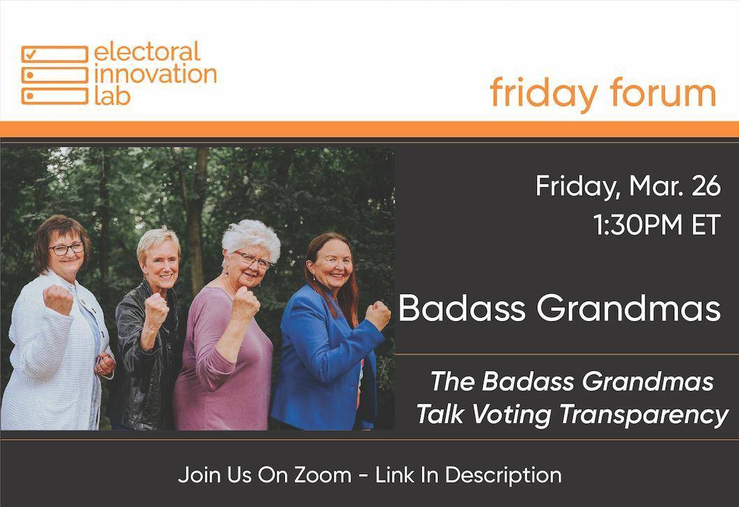The Electoral Innovation Lab at Princeton University presents a Friday Forum: A Talk with Ellen Chaffee, Dina Butcher, and Kathy Tweeten, titled “The Badass Grandmas for Democracy: Making Voting More Transparent in North Dakota.“