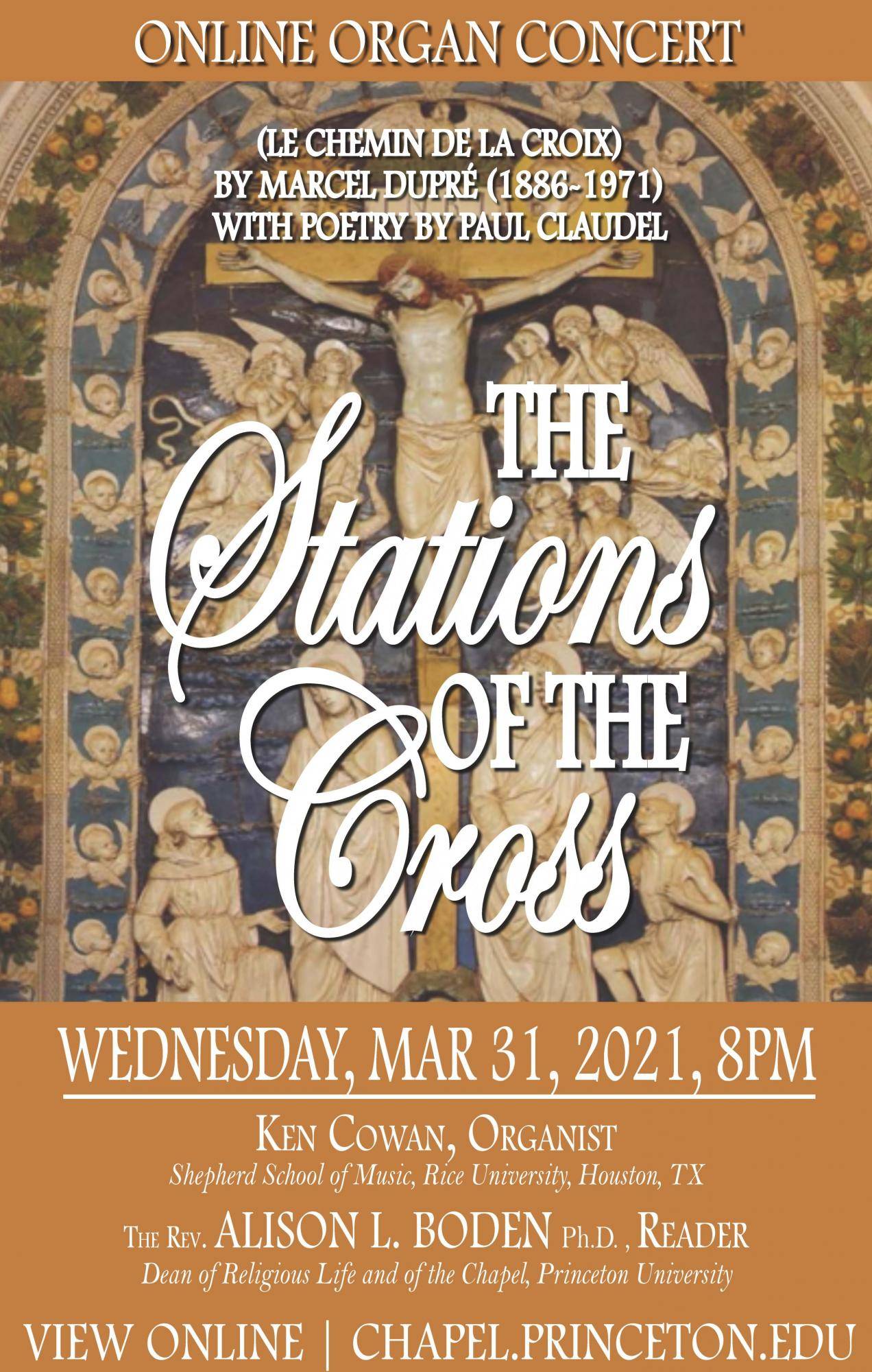Join us online, Wednesday, March 31 for "The Stations of the Cross" by Marcel Dupré. Featuring organist, Ken Cowan, the poetry of Paul Claudel, and Rev. Alison L. Boden, Ph.D. as narrator. The concert premieres at 8pm here and will be available after the premiere for you to view at any time. The program for this service is below.