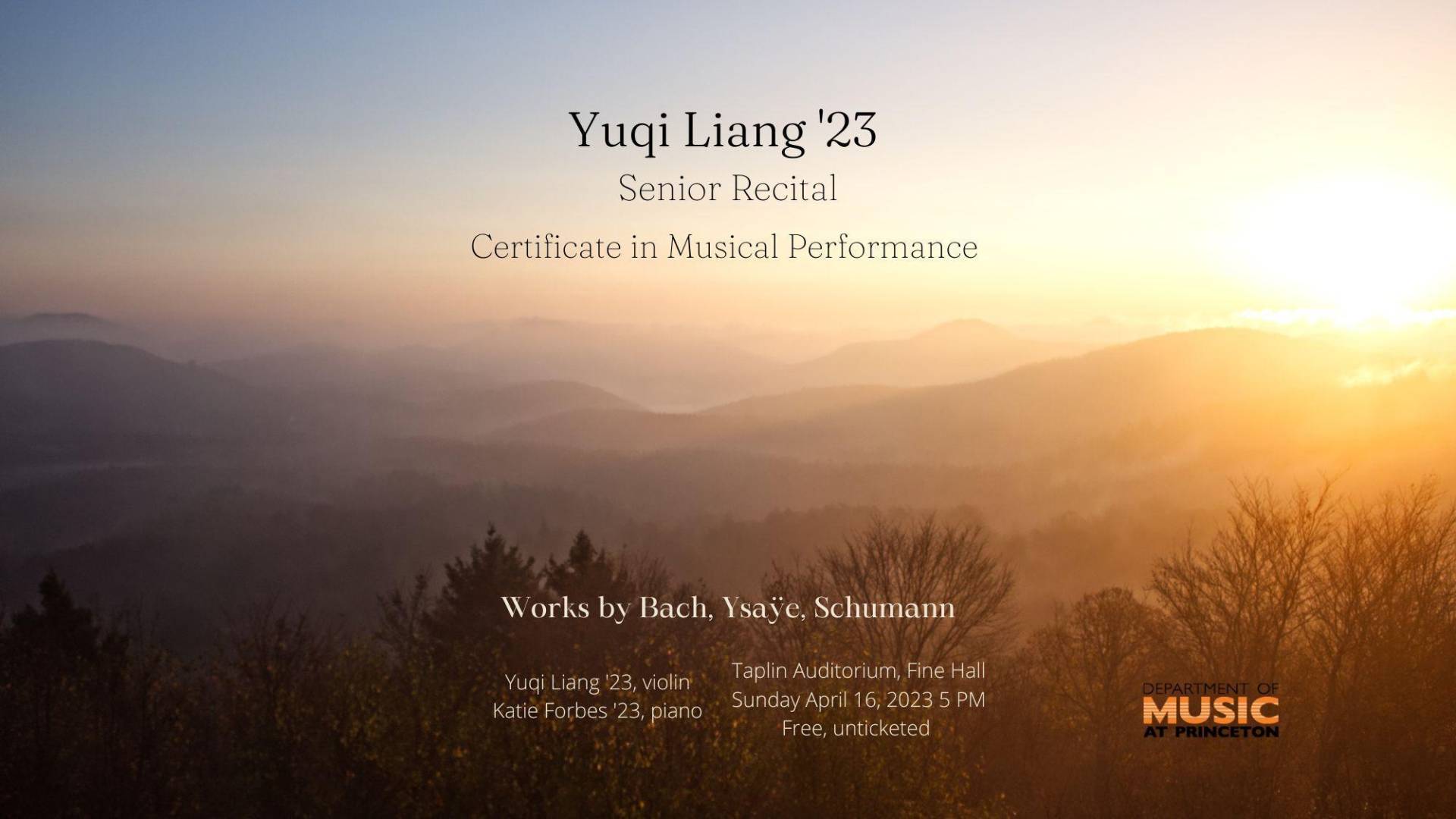 Yuqi Liang ’23 (Violin) performs a senior recital, with works by Bach, Ysaÿe, and Schumann. Featuring: Yuqi Liang ’23, violin Katie Forbes ’23, piano