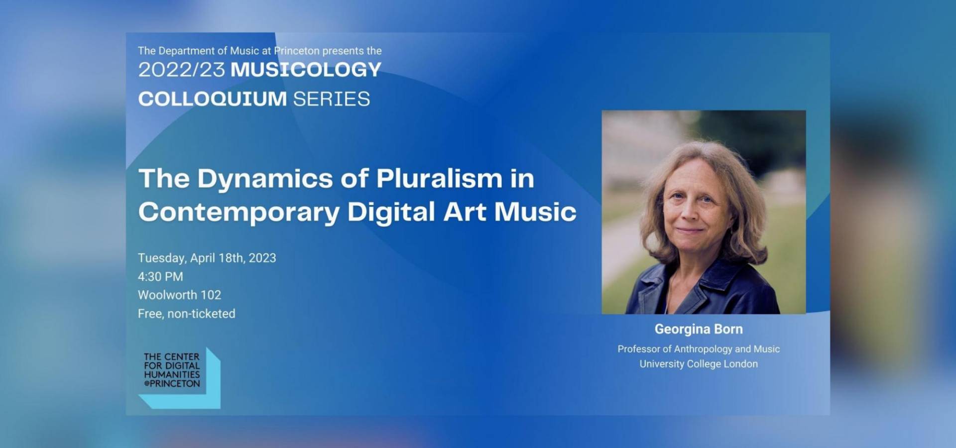 The Musicology Colloquium presents a talk by Georgina Born Georgina Born, Professor of Anthropology and Music of University College London, will discuss The Dynamics of Pluralism in Contemporary Digital Art Music. Abstract: Academic electroacoustic music, and specifically acousmatic music, the modernist lineage that came to prominence from the 1970s in universities in the UK, Canada and Europe, has been both hegemonic and waning for around twenty years. In this presentation, based on a chapter from the book Music and Digital Media: A Planetary Anthropology, Georgina explores this state of affairs through an ethnography of innovative British university trainings in computer music, digital art music, sound art and related scenes –– trainings she gathers under the term ‘music technology degrees’. The aim is to probe the burgeoning pluralism of digital art music in the UK as this presses on contemporary music writ large. Georgina’s fieldwork focused on three leading British academic centres: the Sonic Arts Research Centre (SARC) at Queen’s University, Belfast, the Music, Technology and Innovation Research Centre (MTIRC) at De Montfort University, Leicester, and the Music and Music Technology groups at the University of Huddersfield. It also involved contacts with music departments at the universities of York, Edinburgh and East Anglia, and the sound art research centre CRiSAP at London’s University of the Arts. She observed teaching and events, attended gigs and conferences, and made relationships with teaching faculty, PhD and Masters students. Through the music technology degrees the chapter narrates a heterogeneous field in motion, buffeted by larger historical processes.
