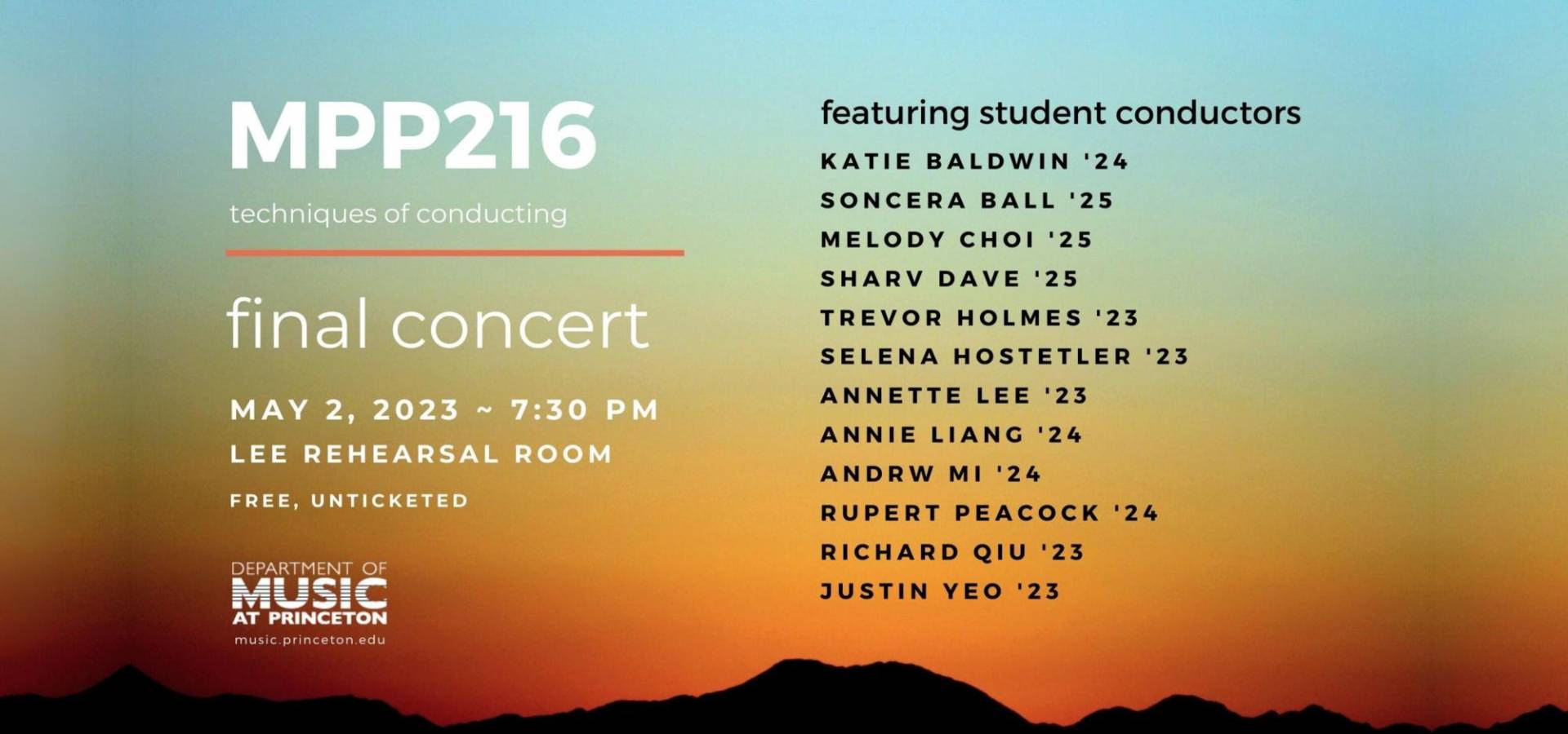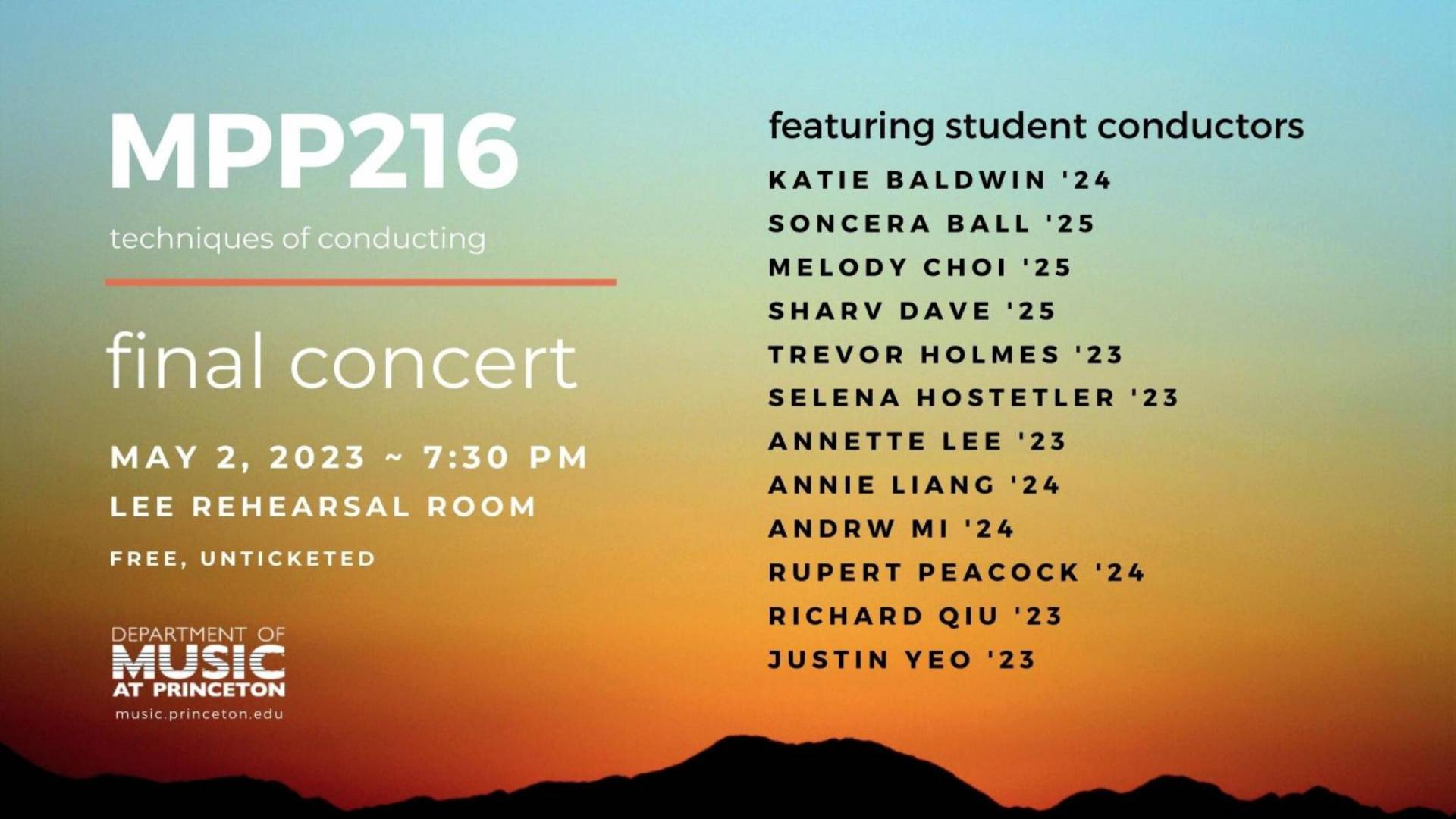 Students from the MPP 216 class will be presenting a final concert, featuring student conductors. Katie Baldwin ’24 Soncera Ball ’25 Melody Choi ’25 Sharv Dave ’25 Trevor Holmes ’23 Selena Hostetler ’23 Annette Lee ’23 Annie Liang ’24 Andrw Mi ’24 Rupert Peacock ’24 Richard Qiu ’23 Justin Yeo ’23