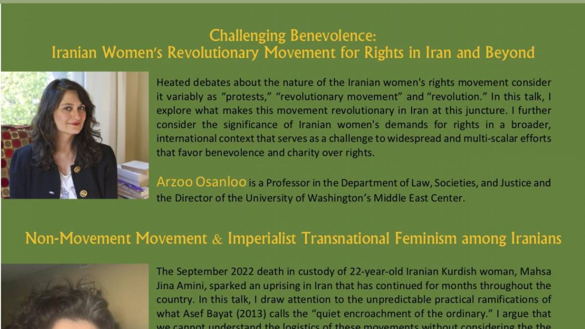 Heated debates about the nature of the Iranian women's rights movement consider it variably as “protests,” “revolutionary movement” and “revolution.” In this talk, I explore what makes this movement revolutionary in Iran at this juncture. I further consider the significance of Iranian women's demands for rights in a broader, international context that serves as a challenge to widespread and multi-scalar efforts that favor benevolence and charity over rights.